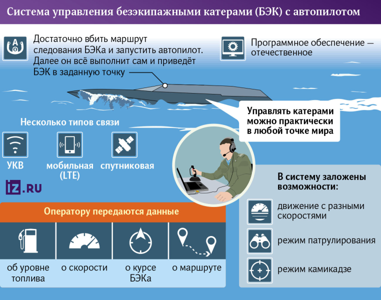 Новая наземная станция управления (НСУ) с автопилотом позволяет управлять безэкипажными катерами практически из любой точки мира. Она помещается в небольшой чемодан весом около 5 кг. Основная задача автопилота — доставить катер к цели без участия человека или при его минимальном участии, рассказал «Известиям» генеральный директор компании-разработчика «Авирон» Игорь Лапин.